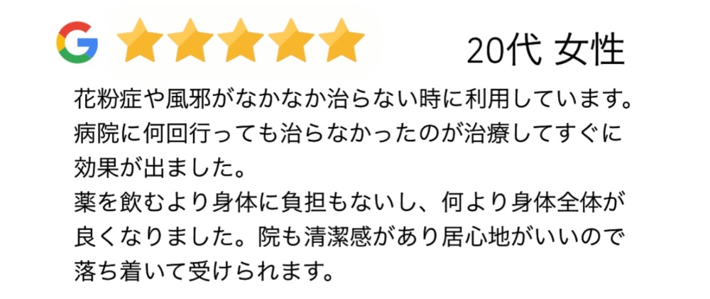 肩こりと頭痛で通院しましたが、一番悩んでいた花粉症が改善したことが驚きでした。毎年悩んでいたので本当に感謝しています。鍼灸治療ってこんなに効くんですね。