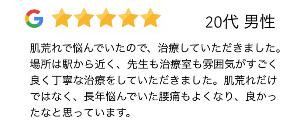 腰椎ヘルニアで仕事を休職していました。鍼治療を受けてすぐに効果を感じ、数日で痛みが消えました。腰痛はもちろん、長年悩んでいた顔の肌荒れが治ったことが一番嬉しかったです。