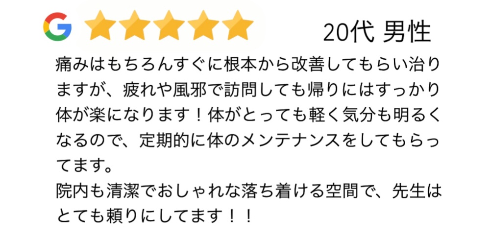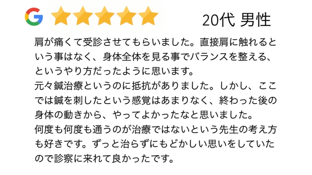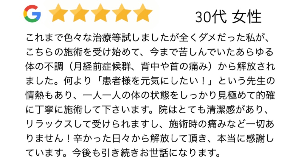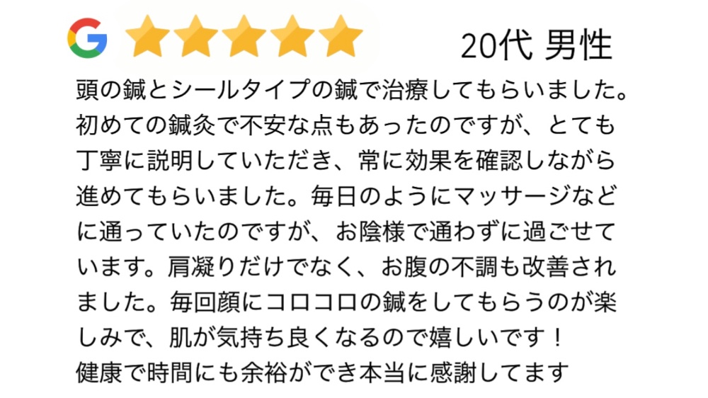 初めての鍼で不安でしたが、痛みが大したことなくてホッとしました。なによりも、鍼が不安ということを当たり前に受け止めてくれて、刺さない鍼から始めてくれたことで、とても安心できました。もちろん効果は素晴らしかったです♪