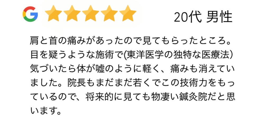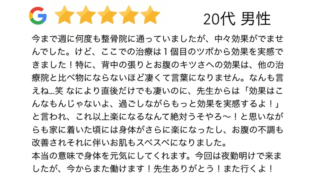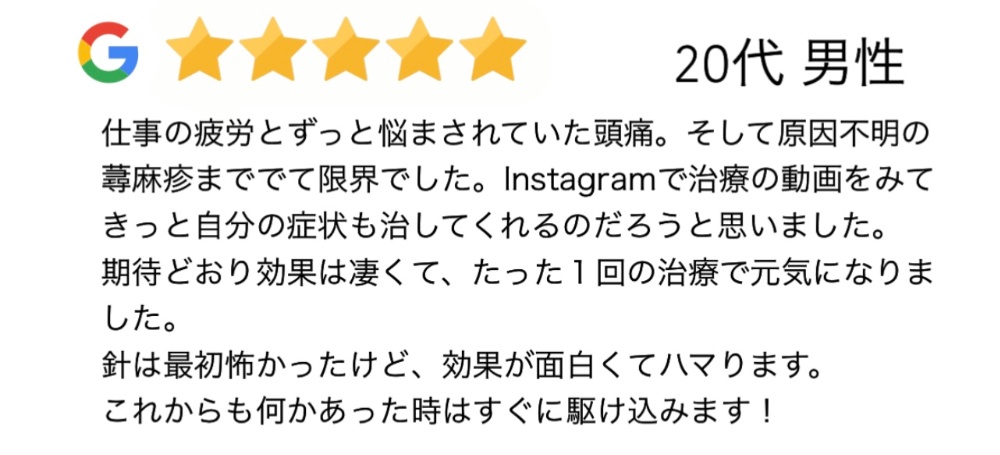 コメント:人は鍼灸を受けると驚きます。期待を高くしても、想像の外の効果があるので、だいたい驚かれます。ただ、魔法ではなく、なんでも治るわけではないので、ご了承ください。