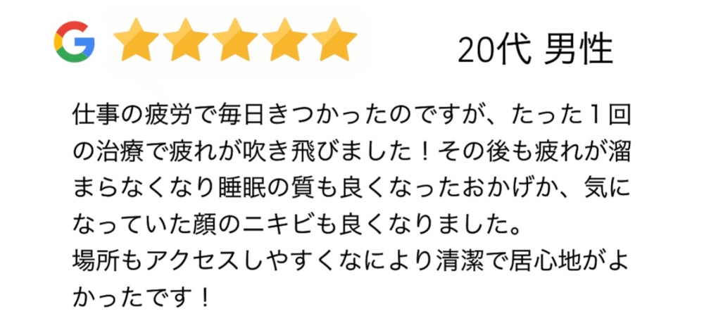 朝起きても疲れが取れない日々が続いていました。お灸が気持ち良くて治療中に寝てしまうほどでした。終わってからは、頭と目がスッキリしていて、疲れも取れていました。
