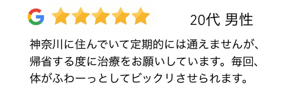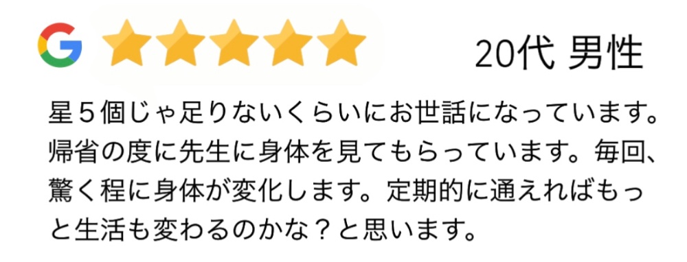 コメント:帰省の際に来院される方は多いです。たった1回でも充分効果を実感されます。是非1度お試しください。
