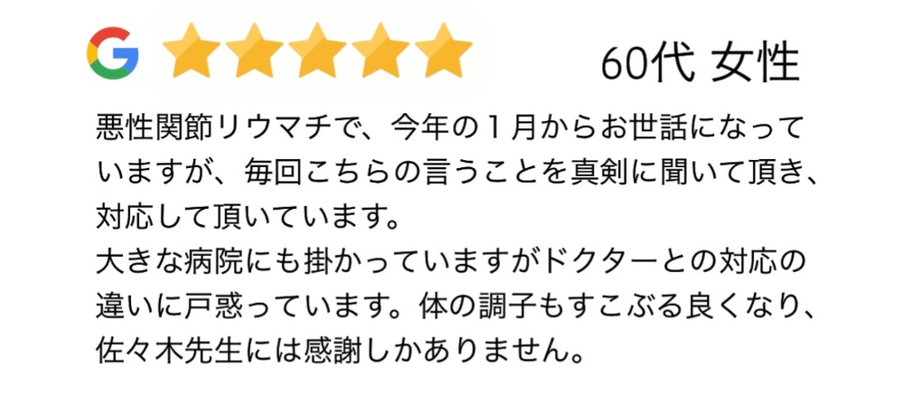 長年いろんな所に治療に行っていましたが、どこでも効果がなく、治療に行く気力すら失いかけていました。こちらでは初回から効果があり、嬉しくて涙が溢れたほどです。希望が持てました。これからも焦らず、少しずつ元気になりたいです。これからもよろしくお願いします。