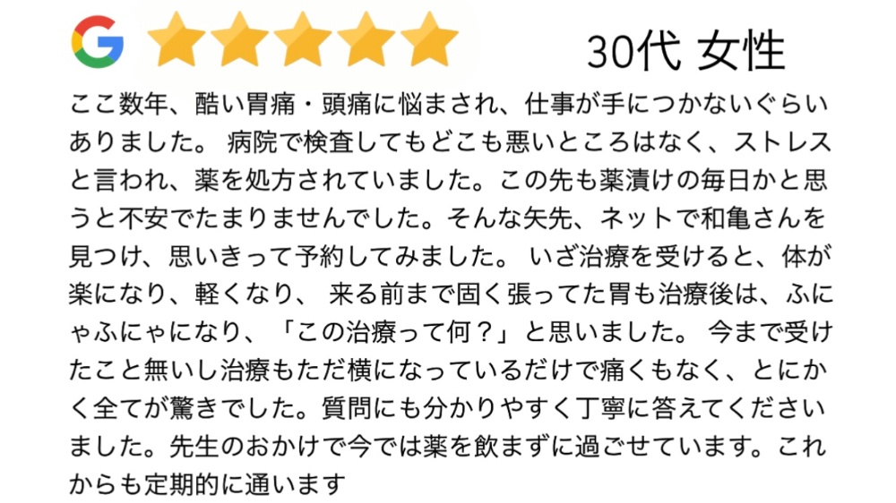 若い頃から胃の痛みで悩んでいました。こちらで鍼治療を受けてすぐに痛みが消えました。胃薬も飲まなくなり本当に感謝しています。